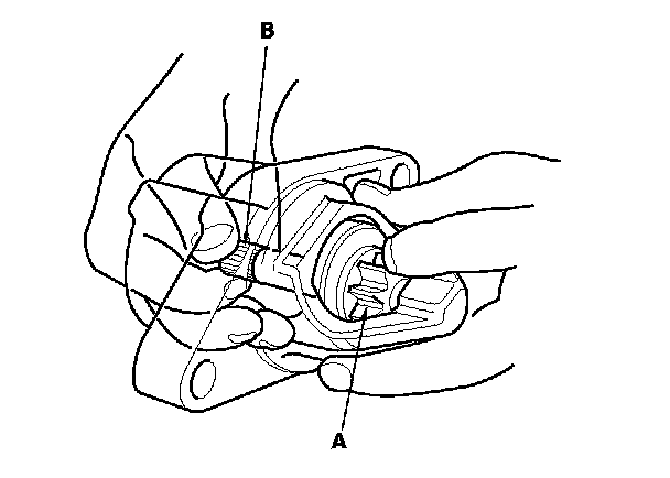 14. Holding the drive gear (A), turn the gear shaft (B) clockwise. Check that the drive gear comes out to the other end. If the drive gear does not move smoothly, replace the gear cover assembly.