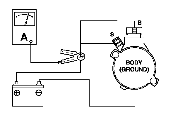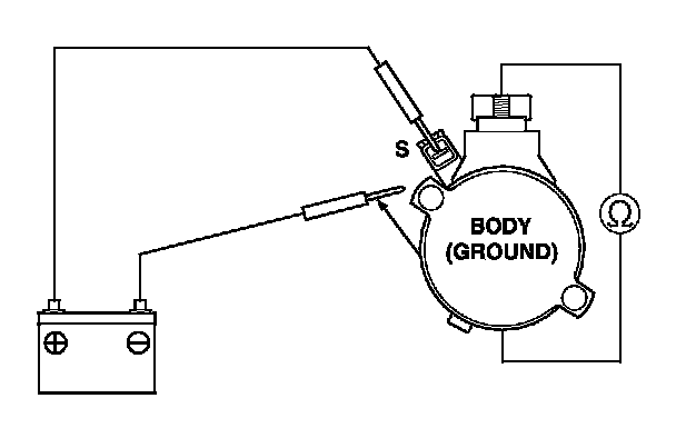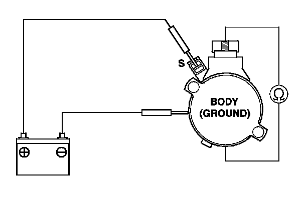 3. Connect the battery as shown, and check for continuity between the B terminal and the starter body. If there is continuity, it is working properly.