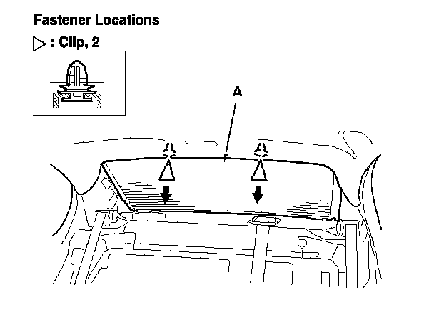 4. Pull down the rear portion of the headliner (A) by detaching the clips. Take care not to bend the headliner excessively, or you may crease or break it.