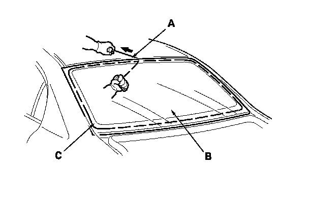 12. Apply primer to the edge of the rear window (A) where the lower rubber dam adhesive tape will be attached as shown. Attach the lower rubber dam (B) with adhesive tape (C) to the lower edge of the rear window: