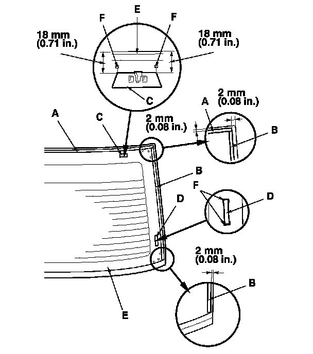 13. Attach the upper rubber dams (A), side rubber dams (B), clips (C), and side fasteners (D) with adhesive tape to the inside face of the rear window (E) as shown: