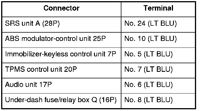 NO - Repair short in the wire between the DLC (K-line) and the ABS modulator-control unit, the SRS unit, the immobilizer-keyless control unit, the TPMS control unit (with TPMS), the audio unit, or the under-dash fuse/relay box.