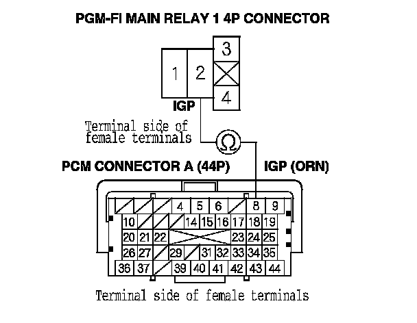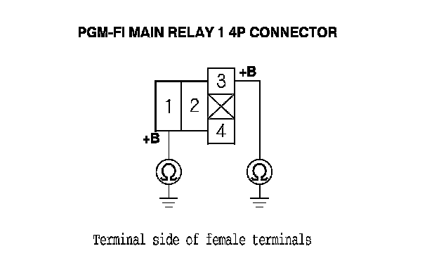 61. Check for continuity between PGM-FI main relay 1 4P connector terminal No. 4 and PCM connector terminal A6.