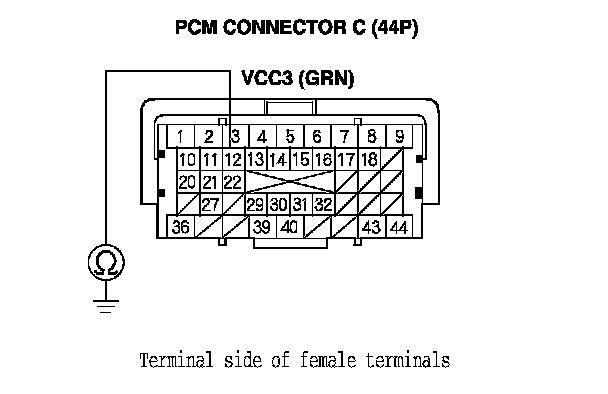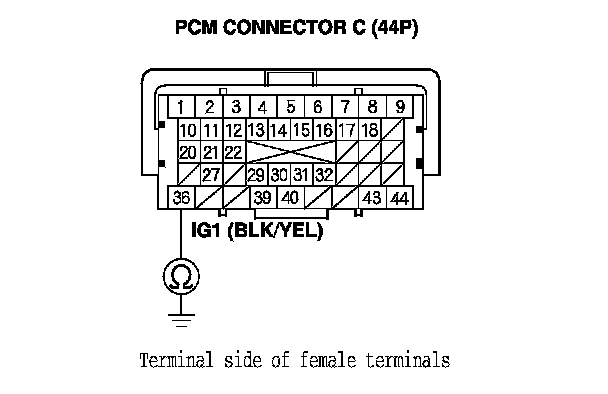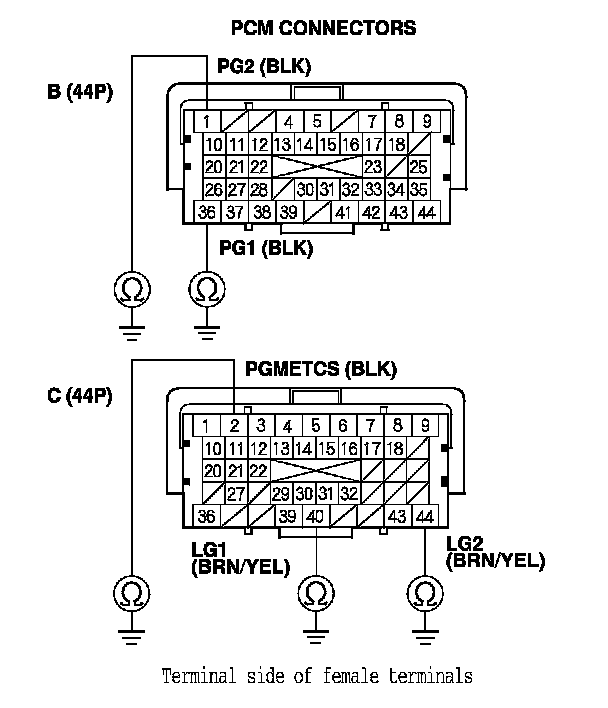 70. Check for continuity between body ground and PCM connector terminals B1, B36, C2, C40, and C44 individually.