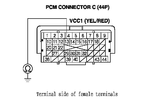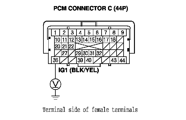 56. Measure the voltage between PCM connector terminal C36 and body ground.