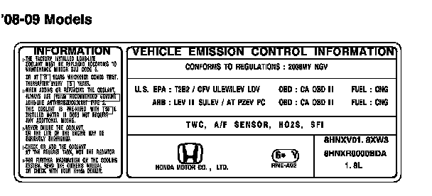 THIS VEHICLE CONFORMS TO U.S. EPA TIER 2 BIN 2 AND CFV/ILEV ULEV REGULATIONS APPLICABLE TO 2007 MODEL YEAR NEW PASSENGER CARS AND CALIFORNIA REGULATIONS APPLICABLE TO 2007 MODEL YEAR NEW LEV II SULEV PASSENGER CARS. THIS VEHICLE HAS ALSO BEEN CERTIFIED AS AN AT-PZEV BY CALIFORNIA AIR RESOURCES BOARD. THIS VEHICLE IS CERTIFIED TO OPERATE ON COMPRESSED NATURAL GAS.