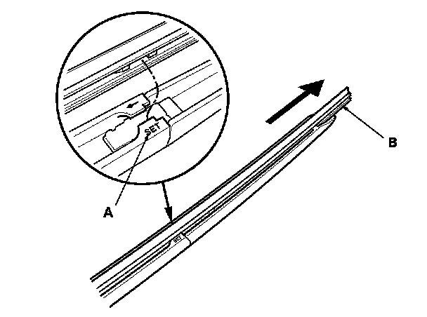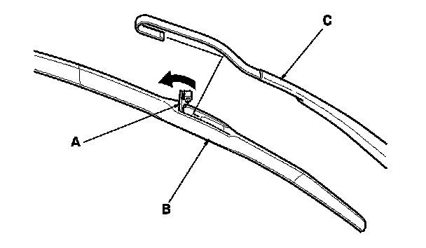 2. Pull up the tab (A), and slide the wiper blade (B) until it releases from the wiper arm (C).