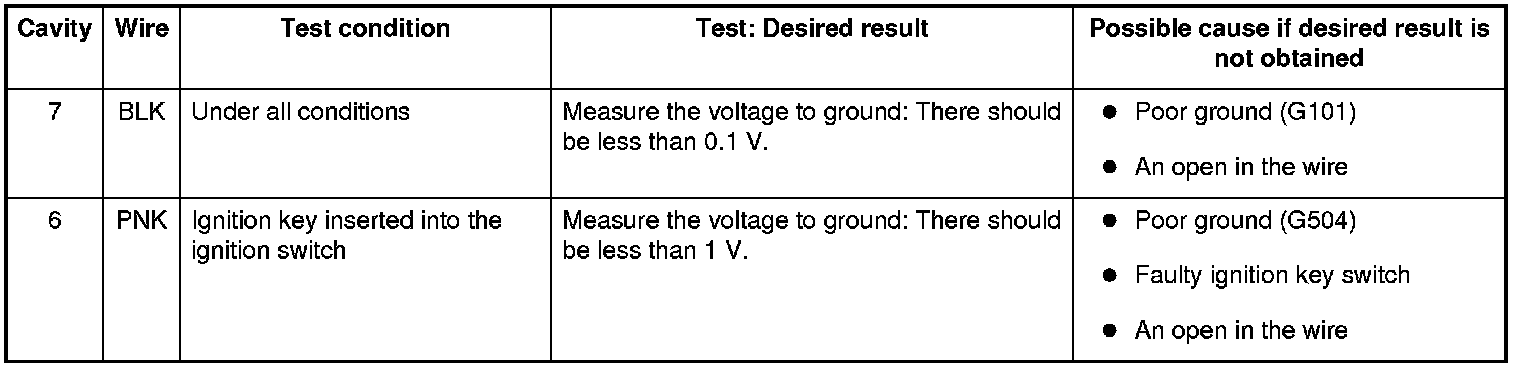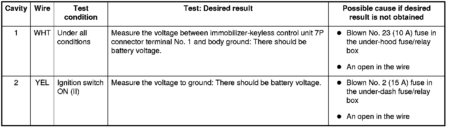 6. Reconnect the connectors to the immobilizer-keyless control unit, and do these input tests at the following connector.