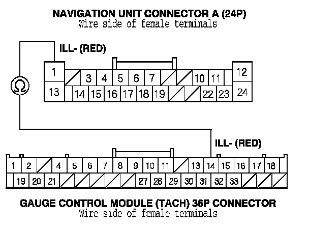 8. Check for continuity between navigation unit connector A (24P) terminal No. 1 and gauge control module (tach) 36P connector terminal No. 14.