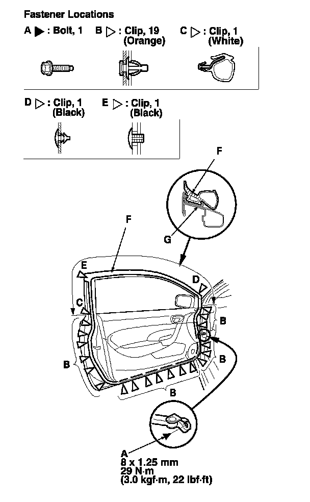 2. Detach the clips (B, C, D, E), then remove the door weatherstrip (F).