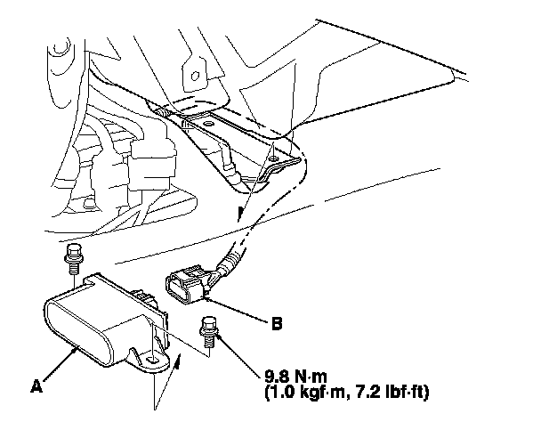 4. Pull out the yaw rate-lateral acceleration sensor, then disconnect the sensor connector (B).