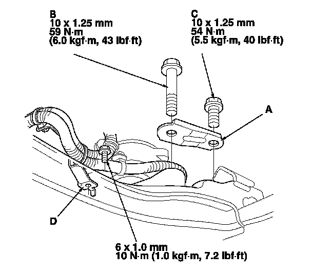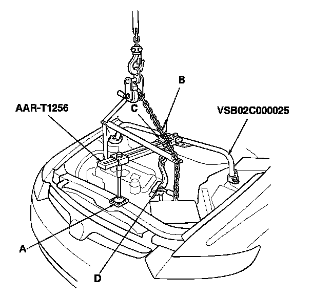 5. Install the front leg assembly (A), the hook (B), and the wing nut (C) to an A and Reds engine support hanger (AAR-T1256) onto the 2006 civic engine hanger (VSB02C000025). Carefully position the engine hanger on the vehicle, and attach the hook to the slotted hole in the support eyelet (D). Tighten the wing nut by hand to lift and support the engine/transmission.
