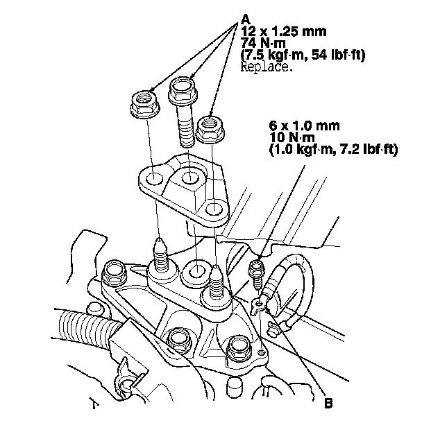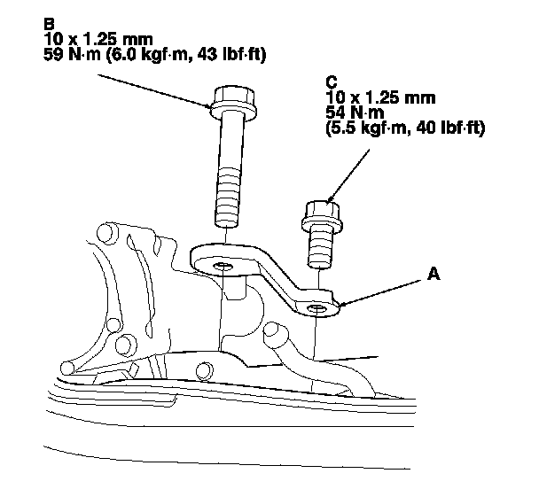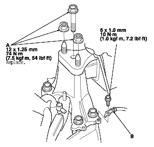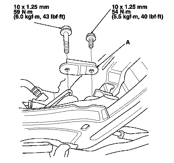 8. Tighten the new transmission mounting bolt and nuts (A).