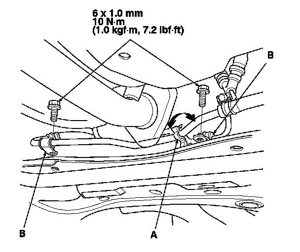24. HPS model: Install the power steering (P/S) line on the clamp (A), then install the P/S line brackets (B) on the front subframe.