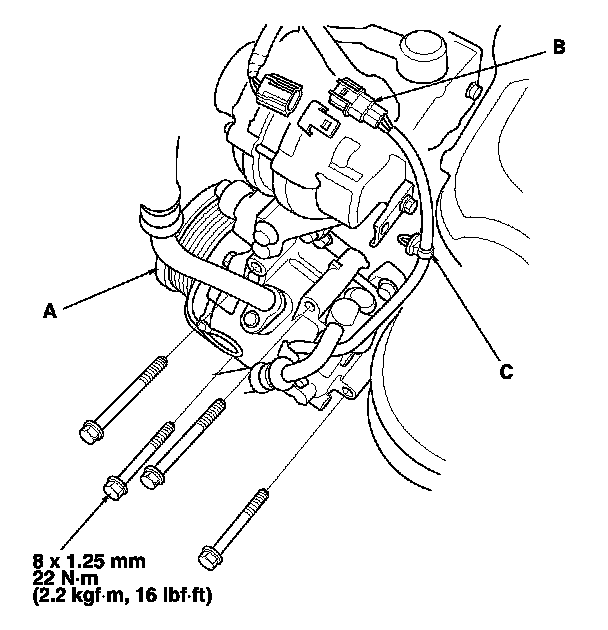 40. Connect the A/C compressor clutch connector (B), then install the harness clamp (C).