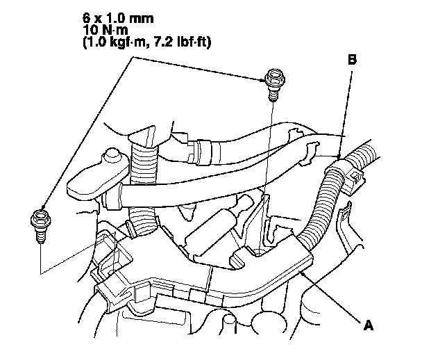 3. Install the 1.8 support eyelet (07AAK-SNAA400) behind the breather pipe (A) and down to the thread hole (B) on the cylinder head.