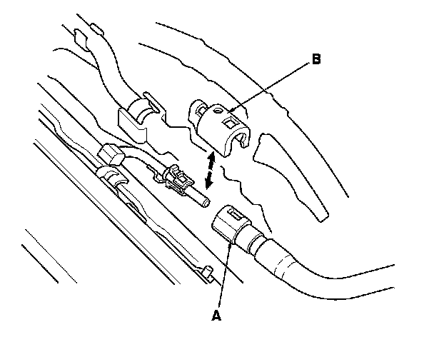 52. Connect the fuel feed hose (A), Fuel Line/Quick-Connect Fitting Installation then install the quick-connect fitting cover (B).