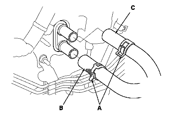 5. From under the hood, slide the hose clamps (A) back. Disconnect the inlet heater hose (B) and the outlet heater hose (C) from the heater unit. Note the orientation of the hose.