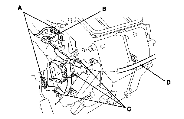11. Disconnect the connectors (A) from the air mix control motor and A/C wire harness. Remove the connector clip (B), the wire harness clips (C), and the wire harness (D).