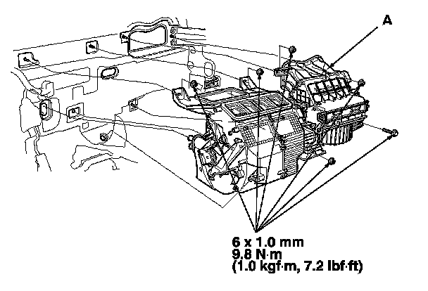 12. Remove the mounting bolt, the mounting nuts, and the blower-heater unit (A).