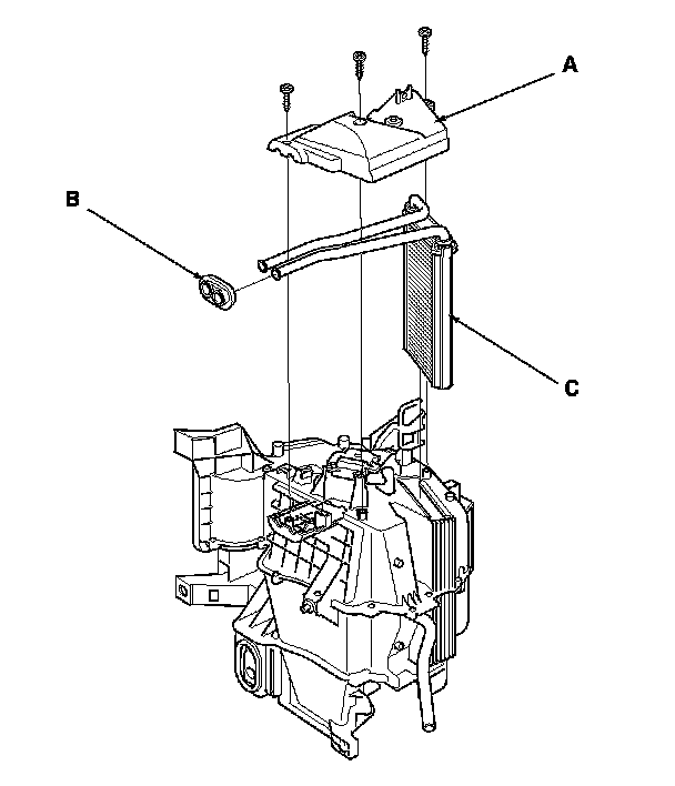 13. Remove the self-tapping screws, the heater core cover (A), the grommet (B), and carefully pull out the heater core (C).