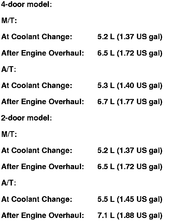Engine Coolant Capacities (Including the coolant reservoir capacity of 0.4 L (0.11 US gal)):