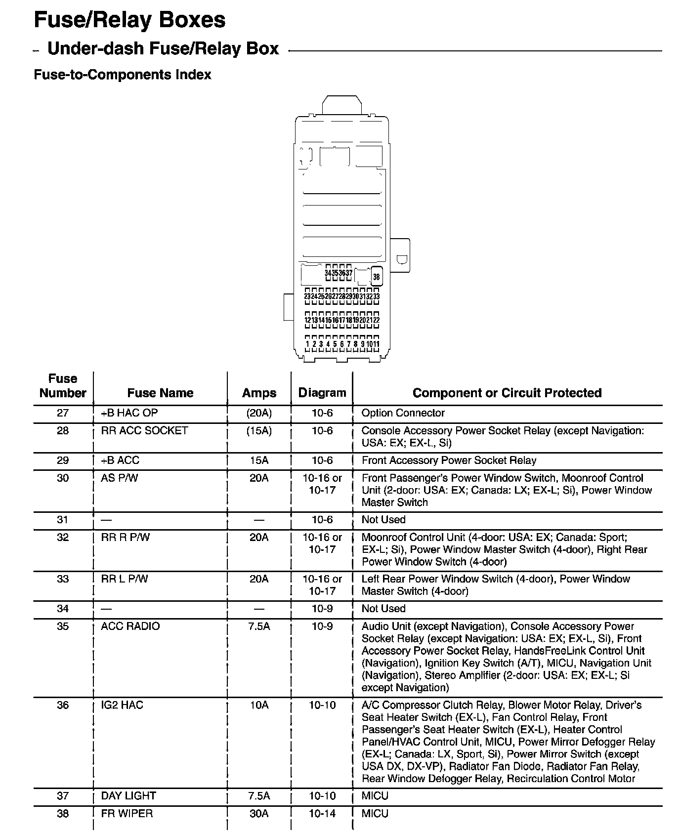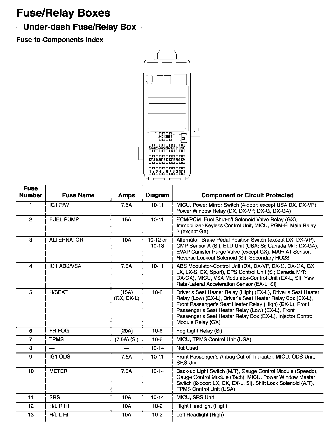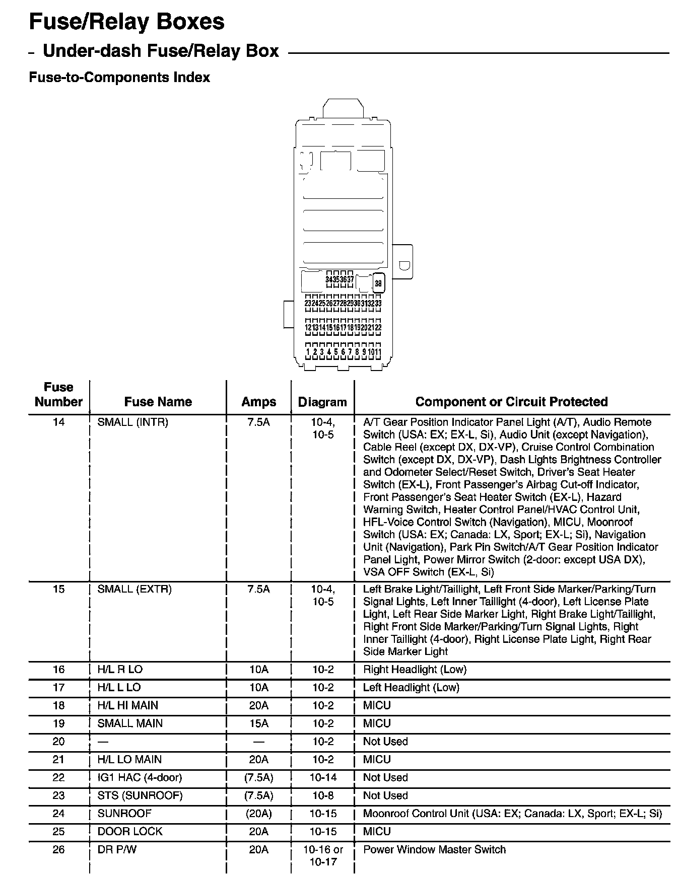 Under-Dash Fuse/Relay Box - Fuse-to-Components Index