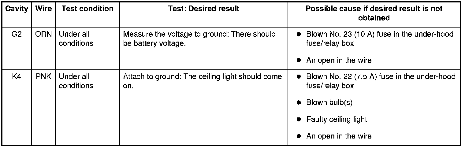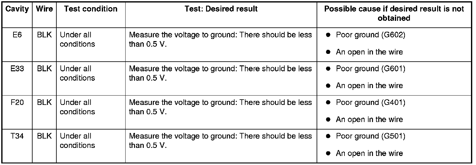 6. Reconnect the connectors to the under-dash fuse/relay box, and do these input tests at the following connectors.