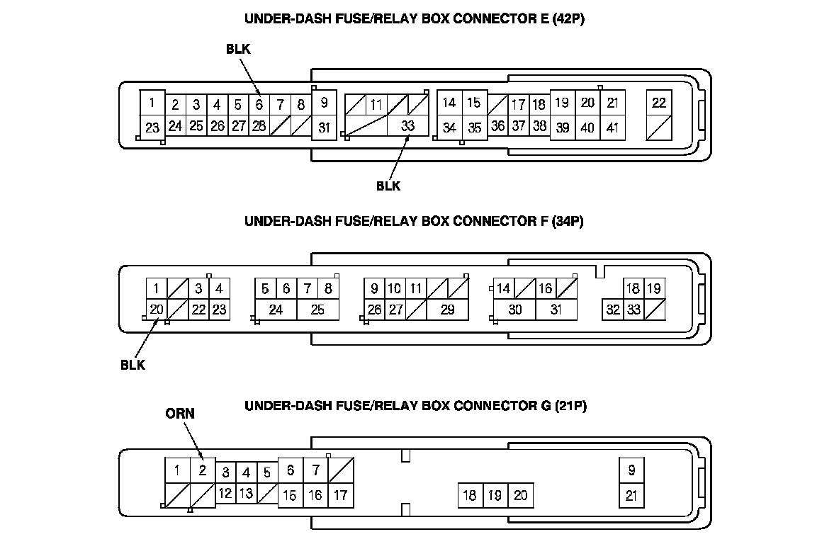 3. Disconnect under-dash fuse/relay box connectors E, F, G, K, and T.
