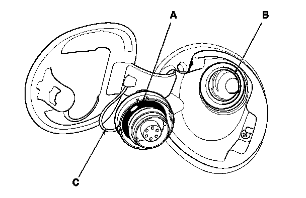 2. Check the fuel fill cap seal (A) and the fuel fill pipe mating surface (B). Verify that the fuel fill cap tether cord (C) is not caught under the cap.