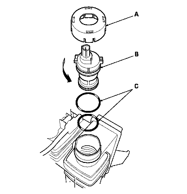 4. Install the parts in the reverse order of removal with new O-rings (C) and a new cap.