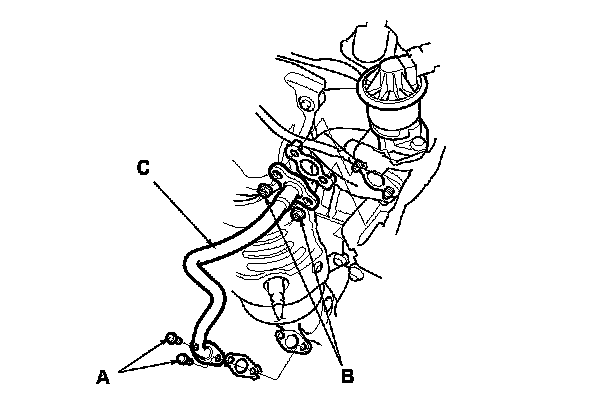 2. Install the EGR pipe on the TWC side, and tighten the bolts (C) with a new gasket (D).