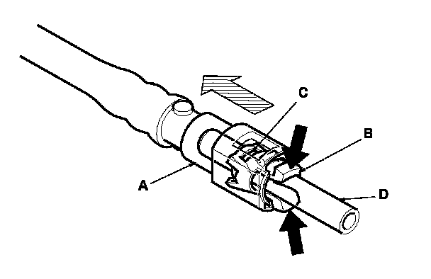 3. Place a rag or shop towel over the quick-connect fitting. Hold the connector (A) with one hand, and squeeze the retainer tabs (B) with the other hand to release them from the locking tabs (C). Pull the connector off.