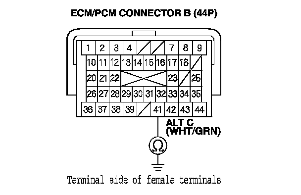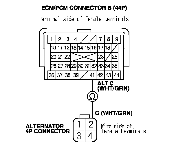 13. Check for continuity between ECM/PCM connector terminal B41 and alternator 4P connector terminal No. 2.