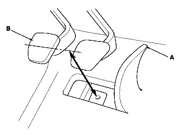 1. Lift up the carpet (A). At the insulator cutout, measure the pedal height from the right side of the pedal pad (B).