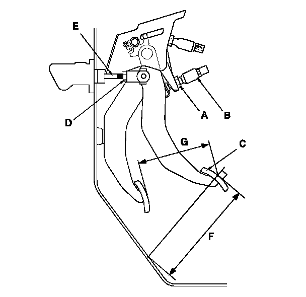 3. Loosen the clutch pushrod locknut (D), and turn the pushrod (E) in or out to get the specified height (F) and stroke (G) at the clutch pedal. If adjusting the pushrod causes the clutch pedal to contact the clutch pedal position switch, back off the switch further.