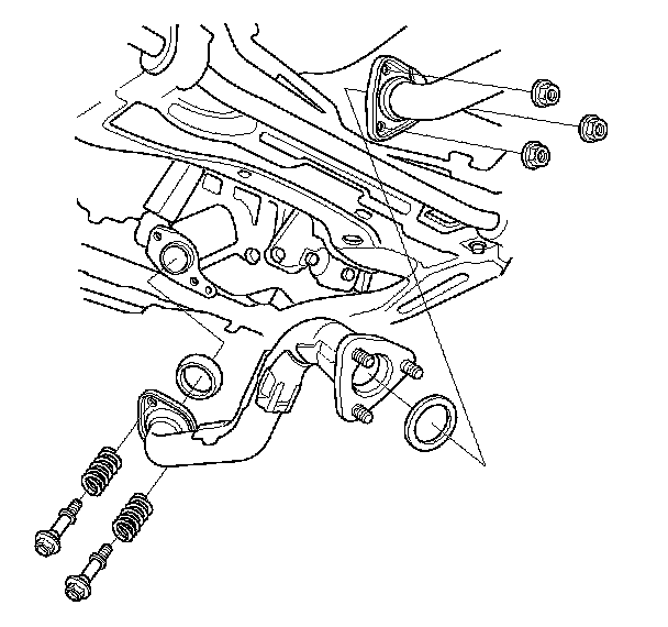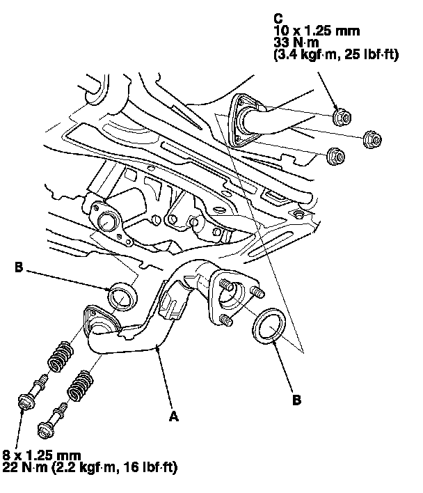 6. Install exhaust pipe A. Use new gaskets (B) and new self-locking nuts (C).