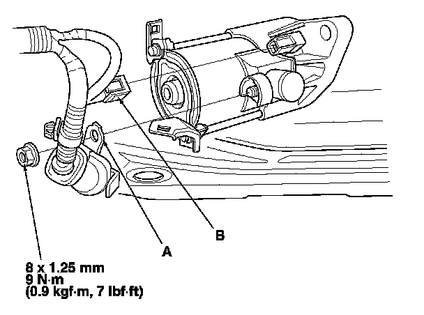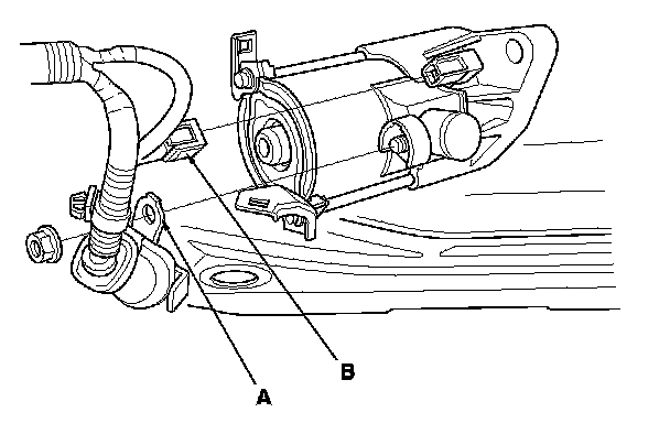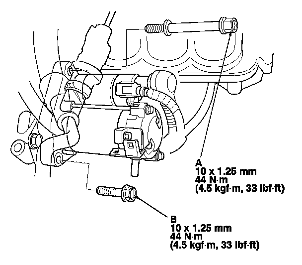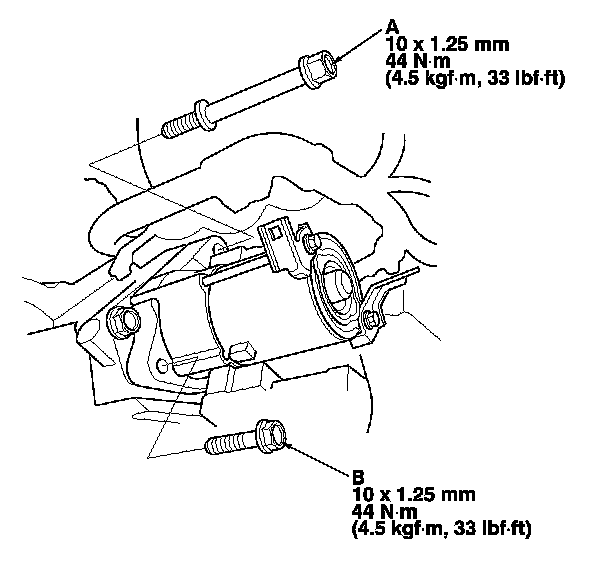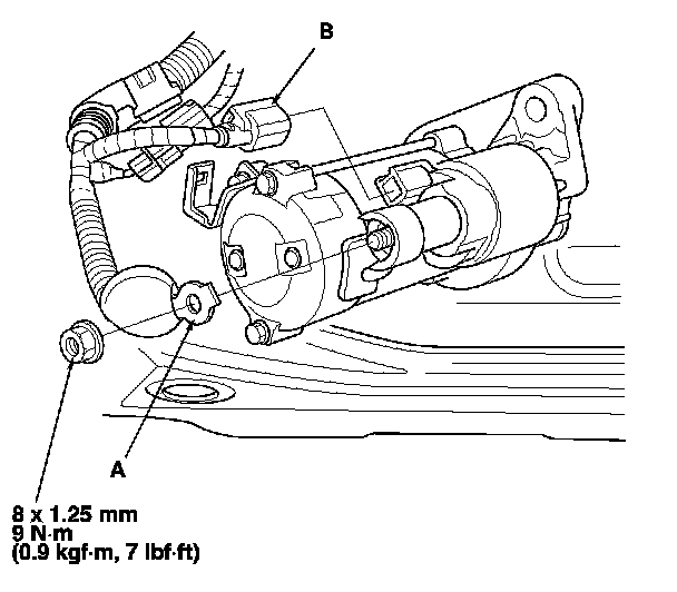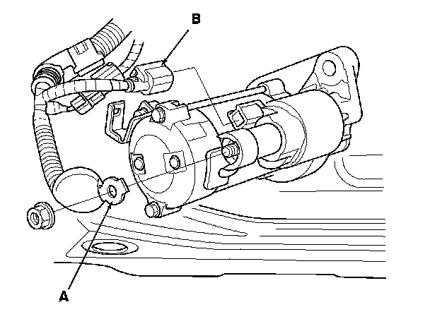 2. Install the starter, then loosely install the upper mounting bolt (A) and the lower mounting bolt (B).