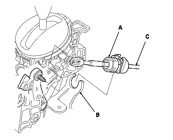 6. Rotate the socket holder retainer (A) counterclockwise, push it against the socket holder bracket (B), then slide the socket holder to remove the shift cable (C) from the bracket.