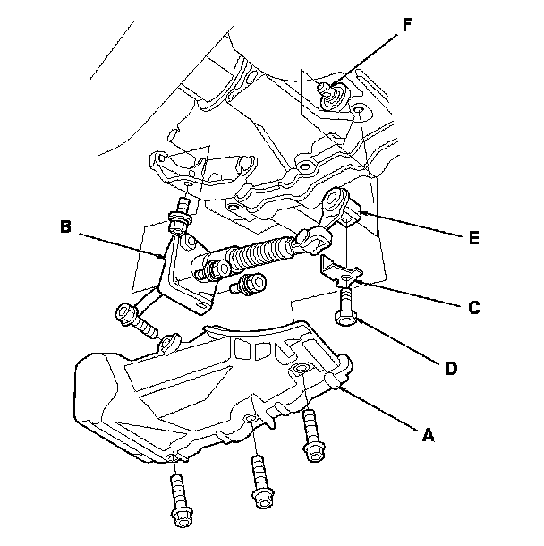 15. Install the shift cable holder (C) on the holder bracket (D), and tighten the bolts loosely. Tighten the bolts (E) in the lateral position to the specified torque, then tighten the bolt (F) in the vertical position.