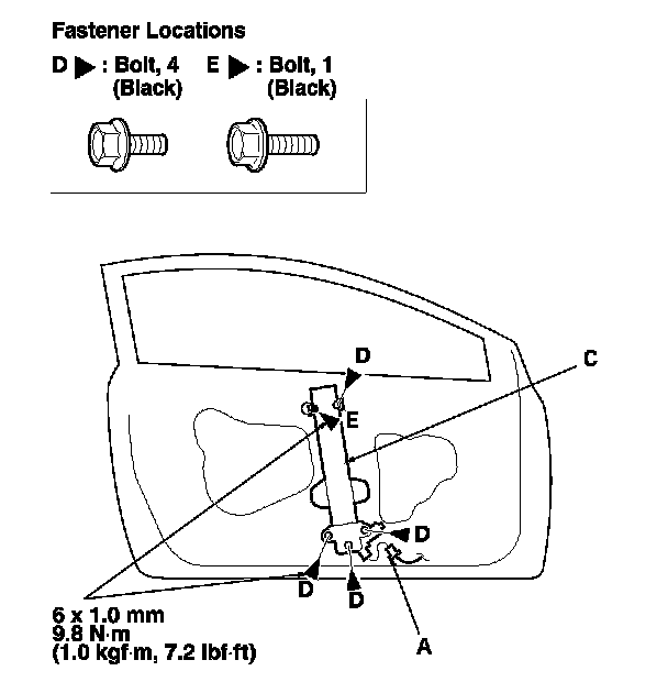 6. Remove the bolts (D), and loosen the bolts (E), then remove the regulator through the hole in the door.