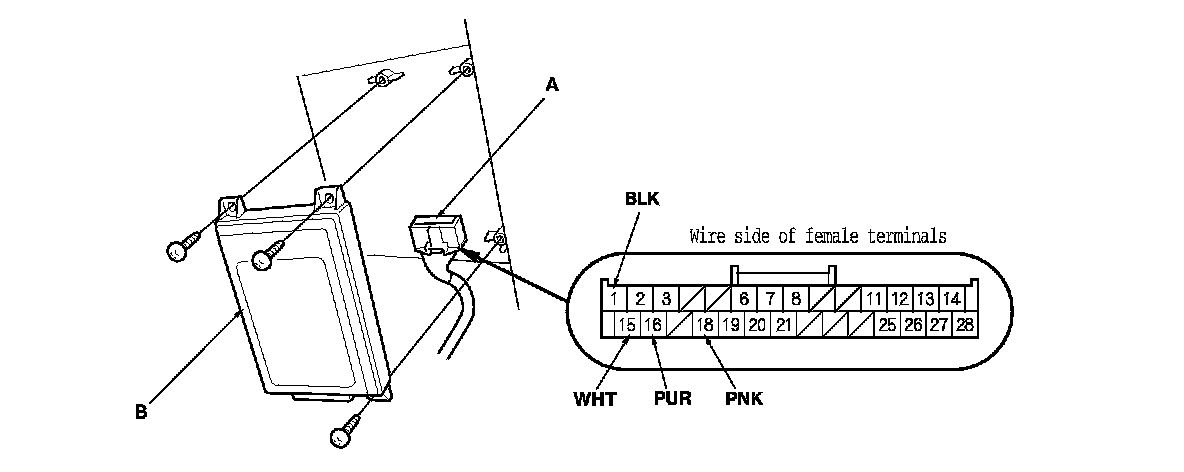 3. Disconnect the 28P connector (A) from the HandsFreeLink control unit (B).