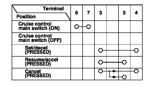 4. Check for continuity between the terminals in each cruise control combination switch position according to the table.