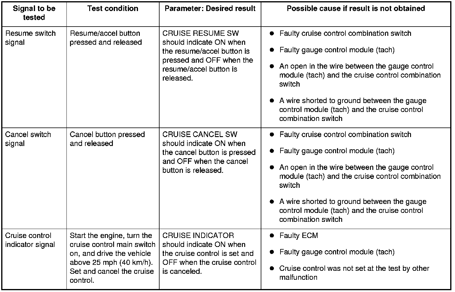 NOTE: Intermittent failures are often caused by loose circuit connections. While monitoring cruise control inputs, flex the circuit wires, and note if any of the test results change.