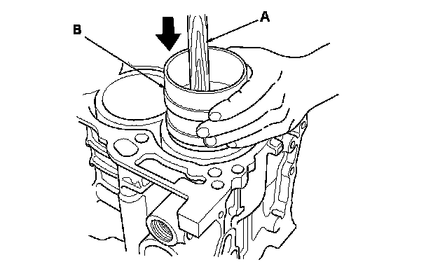 4. Position the piston/connecting rod assembly in the cylinder, and tap it in using the wooden handle of a hammer (A). Push down on the ring compressor (B) to prevent the rings from expanding before entering the cylinder bore.
