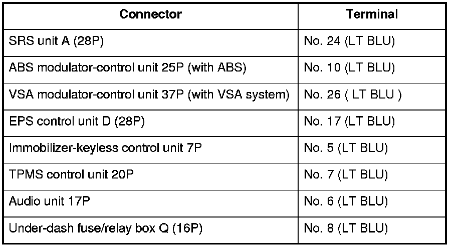 NO - Repair short in the wire between the DLC (K-line) and the ABS modulator-control unit (with ABS), the VSA modulator-control unit (with VSA system), the SRS unit, the EPS control unit, the immobilizer-keyless control unit, the TPMS control unit (with TPMS), the audio unit, or the under-dash fuse/relay box.