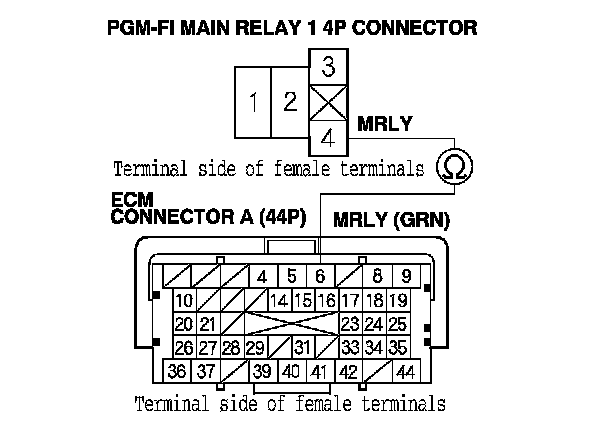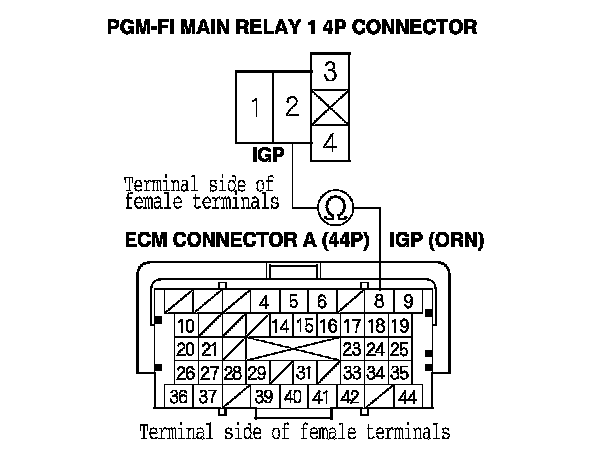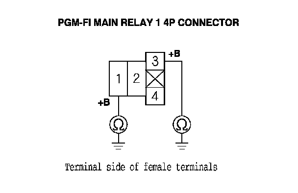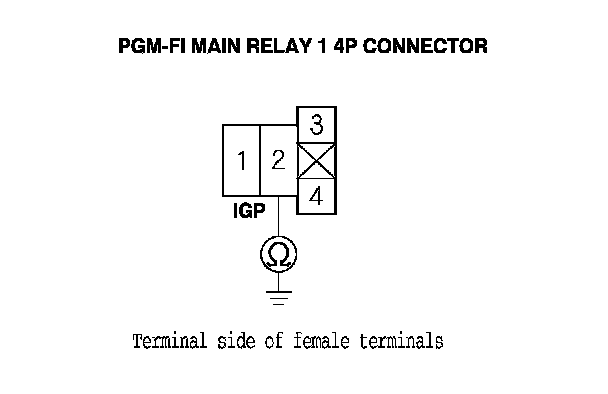 48. Check for continuity between PGM-FI main relay 1 4P connector terminal No. 2 and body ground.