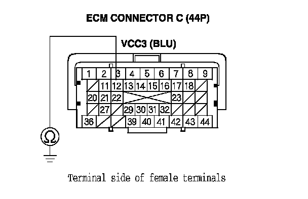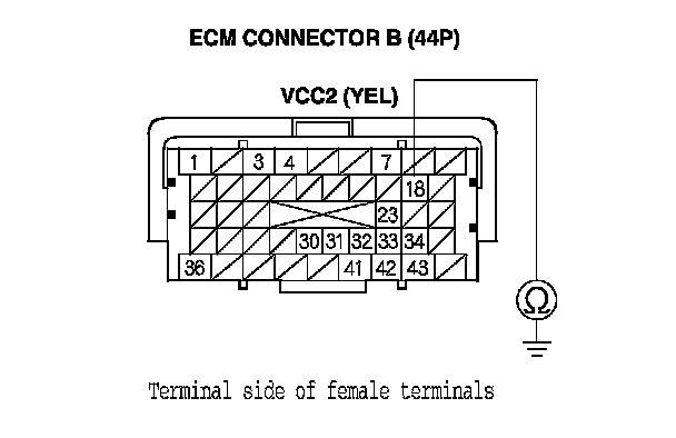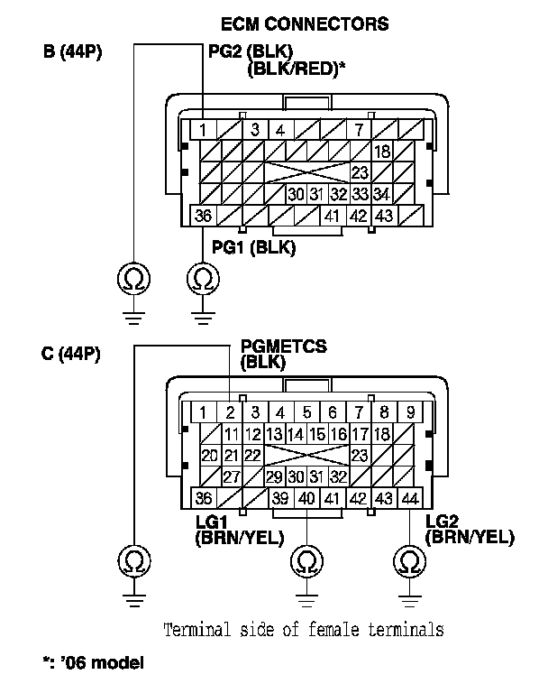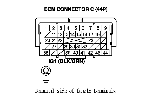 75. Check for continuity between body ground and ECM connector terminals B1, B36, C2, C40, and C44 individually.