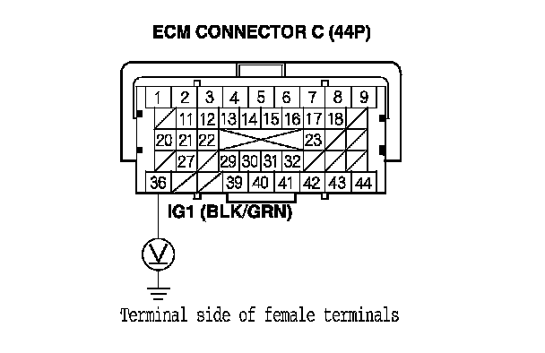 63. Measure the voltage between ECM connector terminal C36 and body ground.