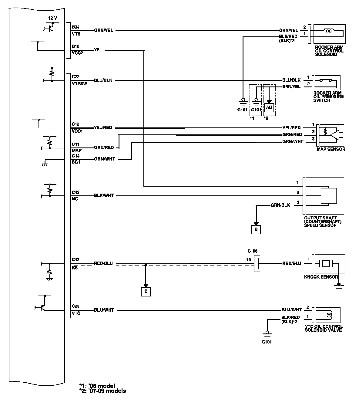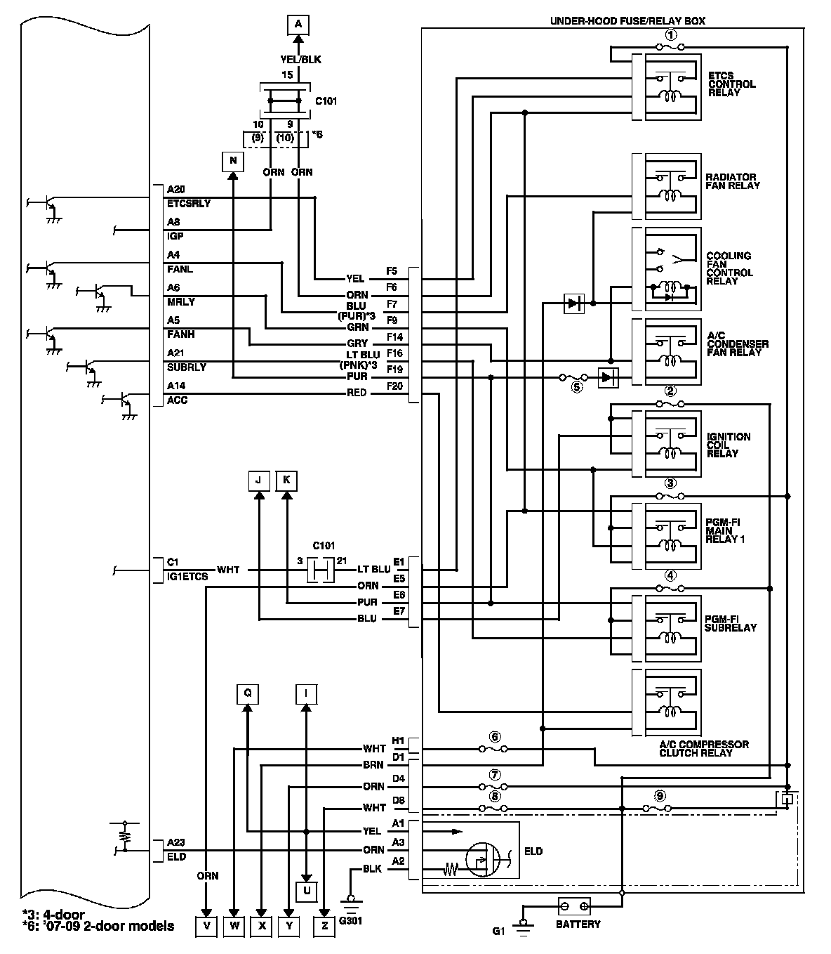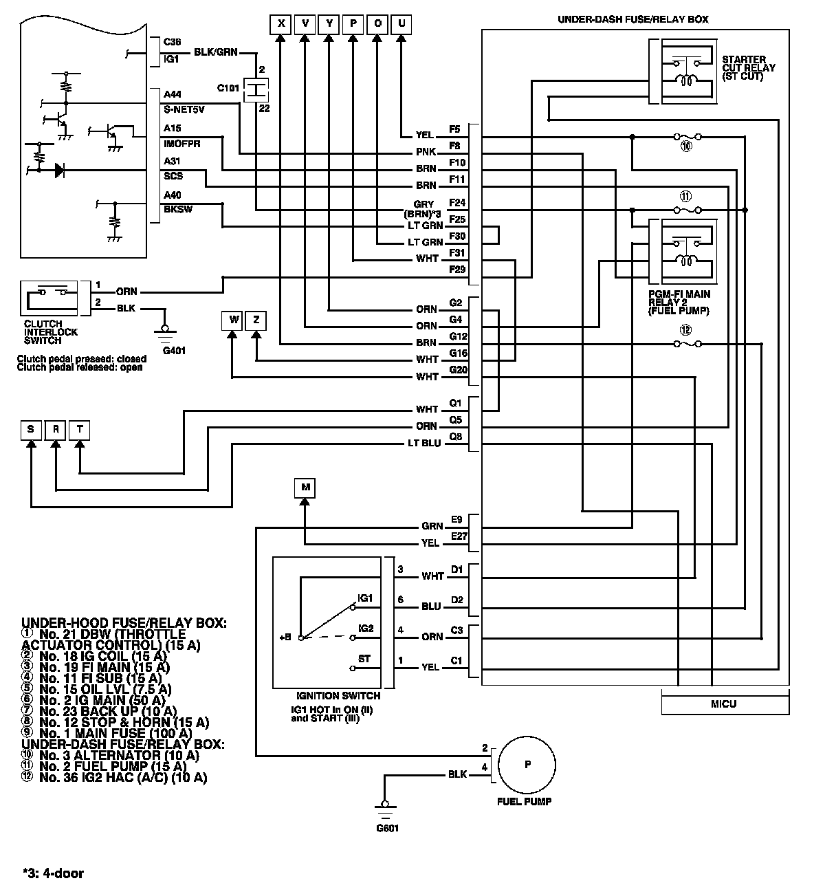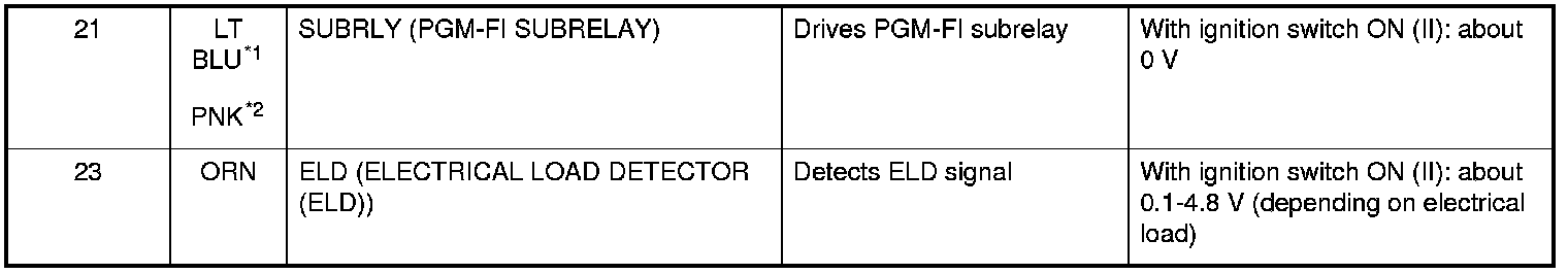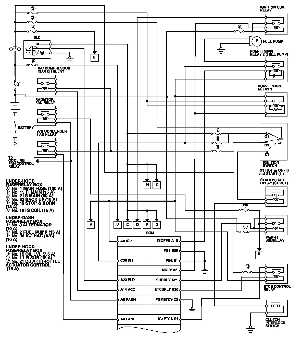 PGM-FI main relay 1 is energized whenever the ignition switch is ON (II), to supply battery voltage to the ECM, power to the injectors, and power for PGM-FI main relay 2 (FUEL PUMP). PGM-FI main relay 2 (FUEL PUMP) is energized to supply power to the fuel pump for 2 seconds when the ignition switch is turned to ON (II), and when the engine is cranking or running.